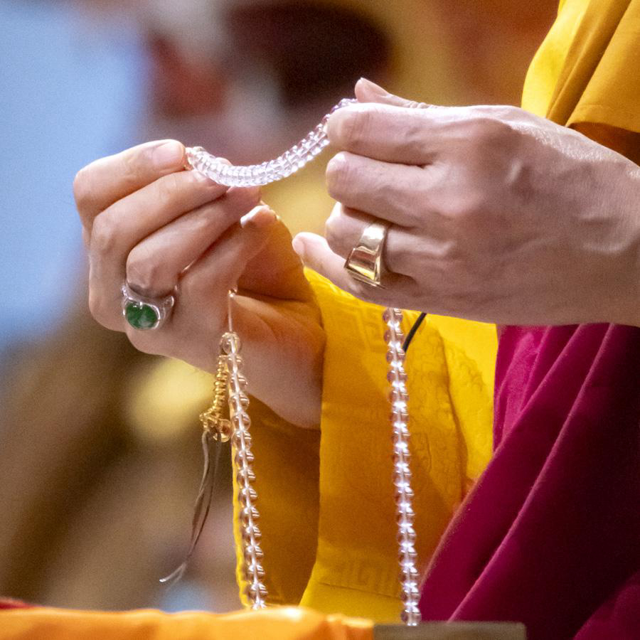 While Rinpoche chanted the Great Six-Syllable Mantra, the ground trembled, and the previously stagnant and murky air became fresh and pure. Rinpoche and the sacred portraits on the mandala radiated great, bright light, and waves of miraculous fragrance arose from the mandala. The Mahavira Hall was filled with unparalleled brightness. All attendees felt as if nectar was being poured upon the crown of their heads, cooling and refreshing them down to the heart. The compassionate Dharma voice settled the previously restless minds of all present.