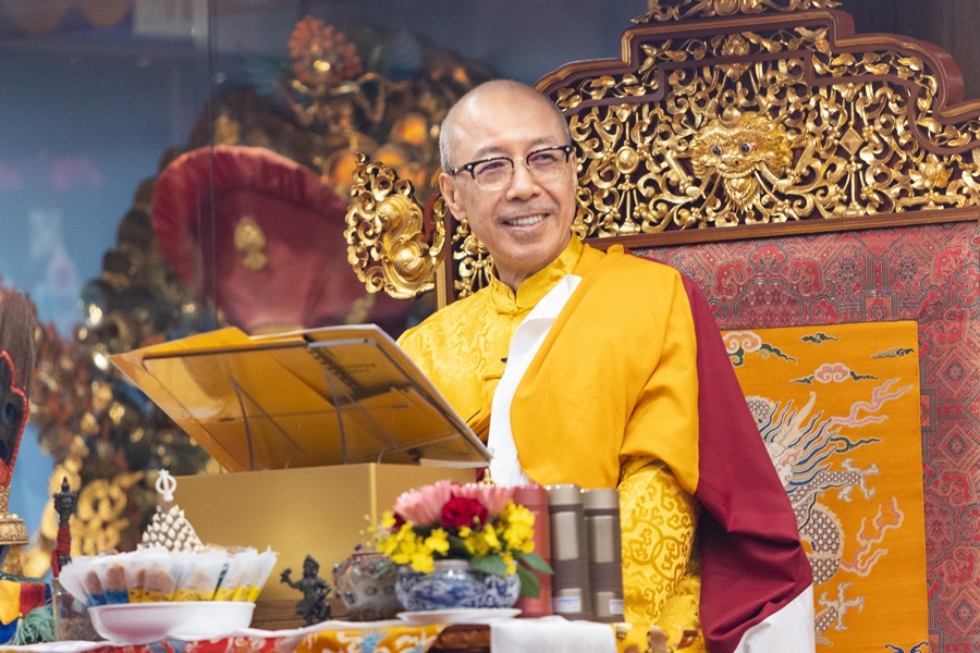 On the morning of August 31, at 9:15 a.m, His Eminence Vajra Guru Rinchen Dorjee Rinpoche performed the Dharma in the Vajra (Secret) Hall of the Glorious Jewel Buddhist Monastery, and simultaneously instructed the monastics to lead the disciples in chanting the Great Six-Syllable Mantra in the Mahavira Hall, beginning at 9:30 a.m. At 11:10 a.m., after completing the Dharma in the Vajra (Secret) Hall without taking any rest, Rinpoche immediately proceeded to the Mahavira Hall to check on the disciples’ chanting. Respectfully led by the dhavja, patākā, monastics, Eight Offering Girls, jeweled sitātapatra, musical instruments, and incense, Rinpoche ascended the Dharma throne and chanted the Great Six-Syllable Mantra.