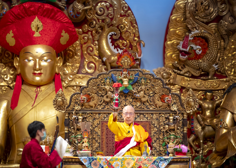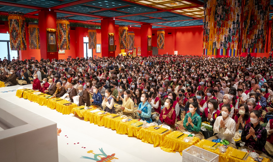 As His Eminence Rinchen Dorjee Rinpoche entered the Mahavira Hall, a miraculous fragrance filled the air— pure and solemn, the assembly instantly felt a sense of calm and serenity arise within body and mind. With great compassion, Rinpoche performed the Dharma, leading the assembly in the recitation of the Longevity Buddha’s mantra, Rinpoche’s sacred body and the mandala simultaneously emitted golden light while the ground trembled. Rinpoche then bestowed the body, speech, and mind empowerments through the Longevity Wish-granting Treasure Vase, torma, and multicolored arrows, bestowing upon the assembly the blessings of the five great elements — earth, wind, water, fire, and emptiness — without any reservation. The assembly felt a warm current of compassion flow through them; some experienced heat throughout their bodies, others a tingling at the crown of the head, and some even felt their hair stand on end — all deeply sensing Rinpoche’s great compassionate vow power to benefit all sentient beings.
