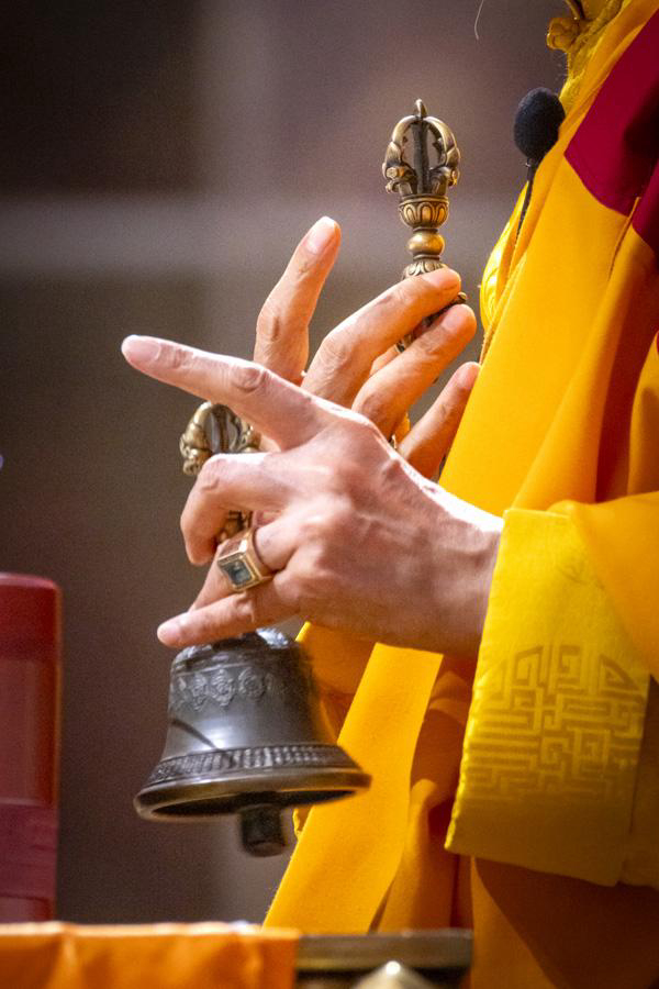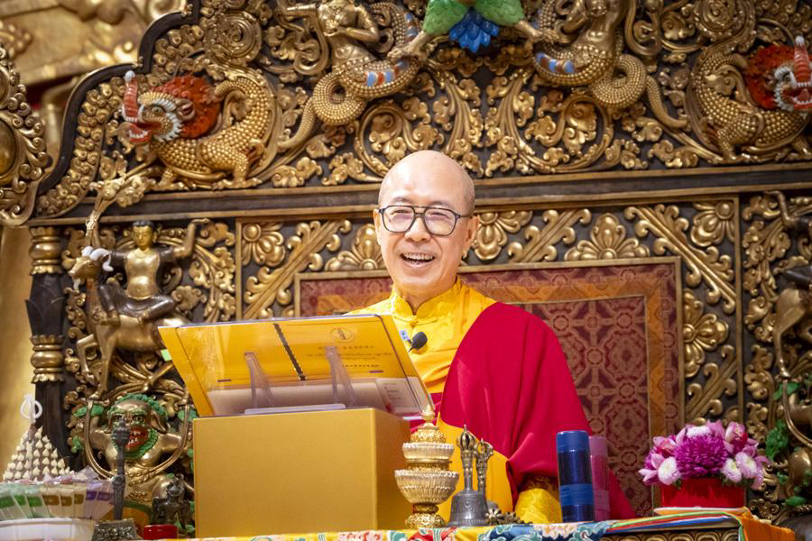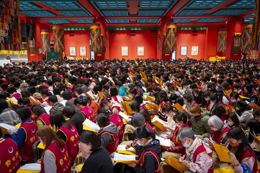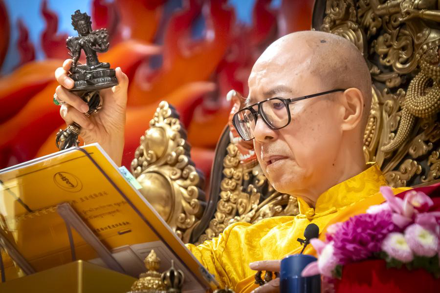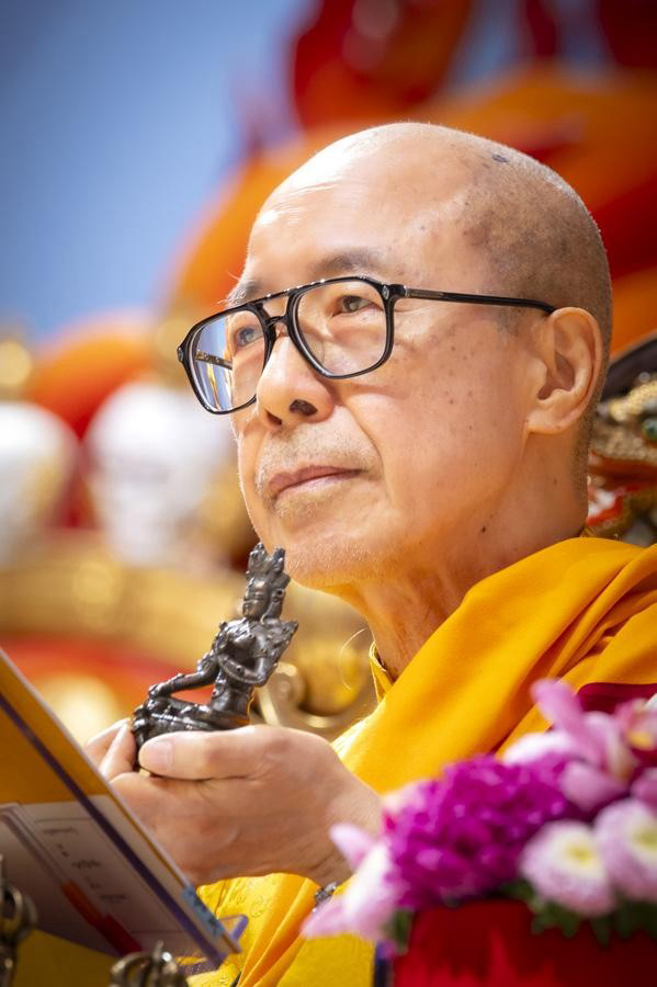Rinpoche compassionately (maitrī and karuṇā) bestowed upon the assembly the recitation of The Praise to the Twenty-One Taras, The Prayer for Merits and Benefits of the Twenty-One Taras, and The Brief Liturgy Prayer of the Twenty-One Taras. He earnestly exhorted everyone to refrain from killing and to adopt a vegetarian diet, to distance themselves from greed and miserliness, to cherish the precious fate to attend the puja, to take refuge in a meritorious guru, and to practice the Dharma to be liberated from the suffering of reincarnation. Before the perfect completion of the puja, Rinpoche especially reminded the assembly that, in the face of the coming year of turbulence, they should remain cautious, tame their tempers, conduct themselves, not go beyond their bounds, and apply the Buddha Dharma they have learned in their daily lives.