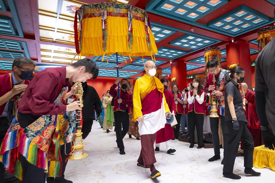 尊きリンチェンドルジェ・リンポチェ猊下は、8月31日午前9時15分より寶吉祥仏寺密殿にてご自身で修法を開始されると同時に、出家衆に弟子らを導き、午前9時30分より大殿にて六字大明呪の持誦を開始するようご指示なされました。午前11時10分、リンポチェ猊下は密殿での修法を終えられると、休む間もなく大殿へとお越しくださり、弟子たちの持呪の様子をご覧になりました。幡、幢、出家僧、八供女、宝傘、楽器、薫香などの荘厳な行列にてお迎え申し上げ、リンポチェ猊下は法座にお登りになり、六字大明呪の持誦をなされました。