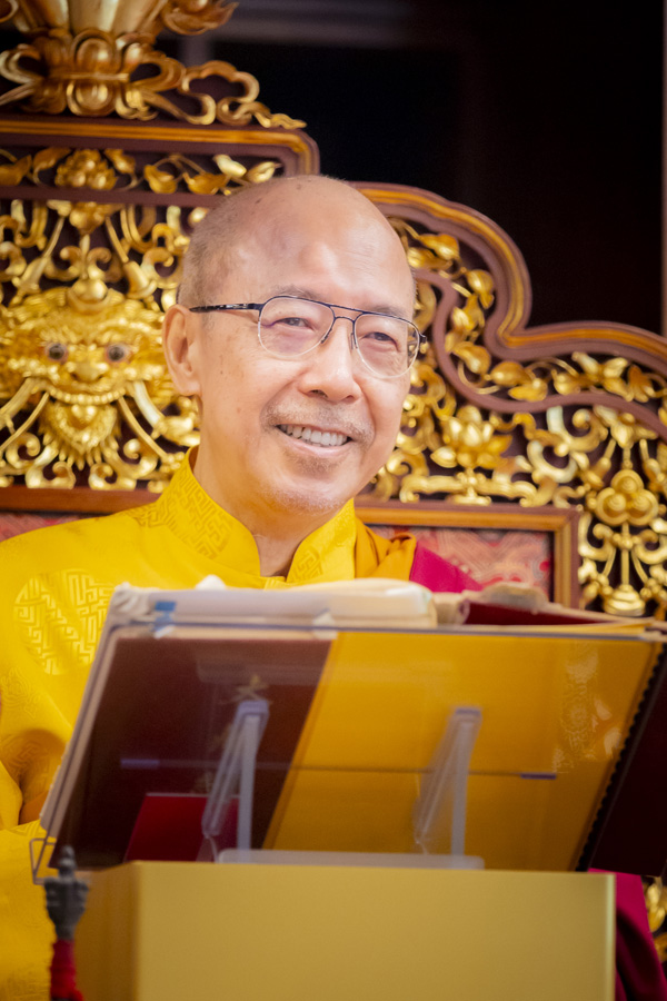 12月14日午前9時、尊き リンチェンドルジェ・リンポチェは、仏寺密殿において殊勝なる密法を修持され、同時に弟子に対し、大殿にて六字大明咒を午前11時30分まで持誦することをお授けになった。正午12時、密殿における法会は円満し、午後1時30分、リンポチェは、幡・幢・出家衆・八供女・宝傘・楽器・薫香の前導および迎請のもと、生花が撒かれた八吉祥の白い絨毯の上を進み、仏寺大殿へ入堂された。参会した大衆は両手を合わせて厳粛に起立し、恭しくリンポチェの法座昇壇をお迎えした。リンポチェは壇城に登り、諸仏菩薩に頂礼された後、慈悲をもって次のように開示された。「私は今、
