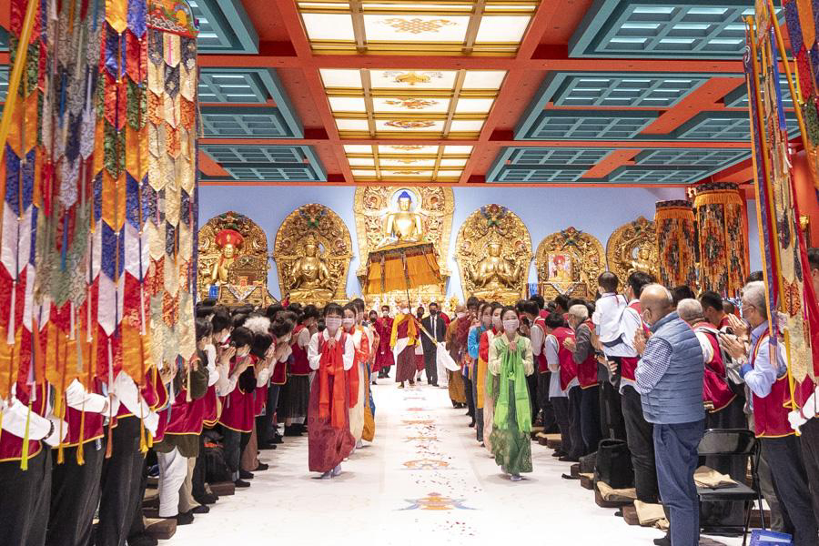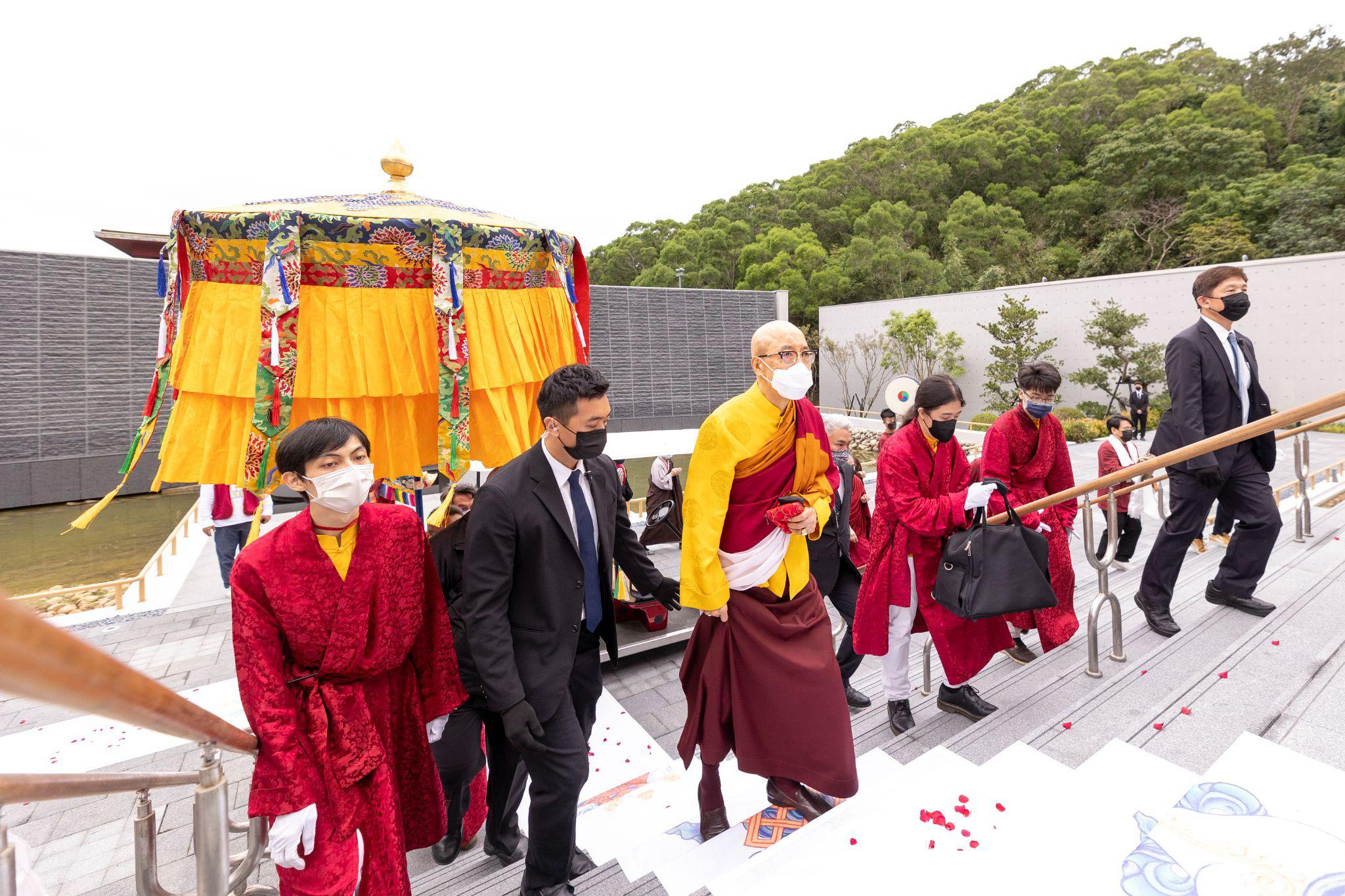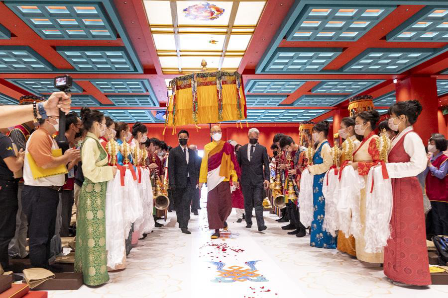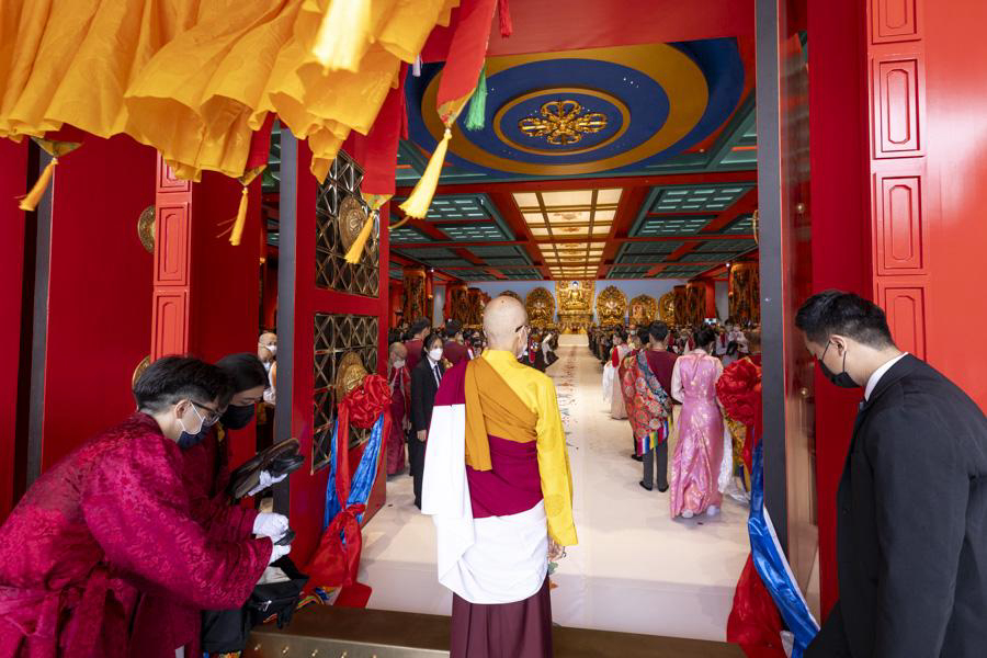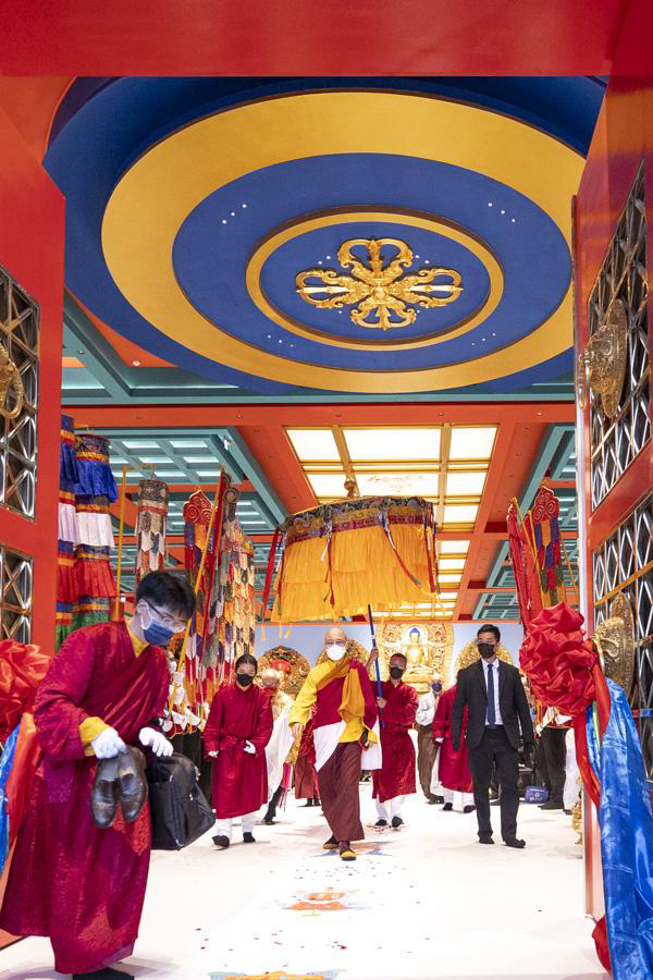 尊貴的 仁欽多吉仁波切在經幡、顯密出家眾、八供女、寶傘、樂器、薰香的前導及迎請下,行經灑滿鮮花的八吉祥白地毯進入佛寺大殿。