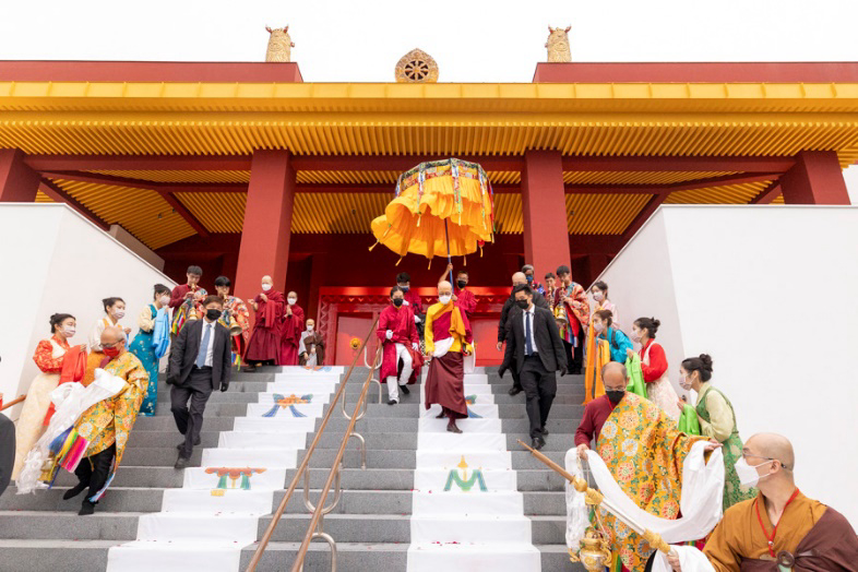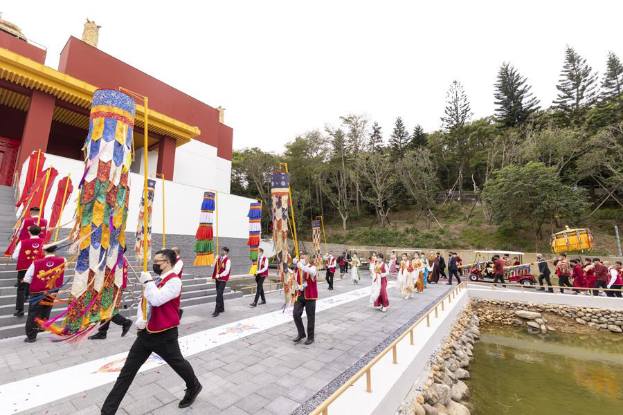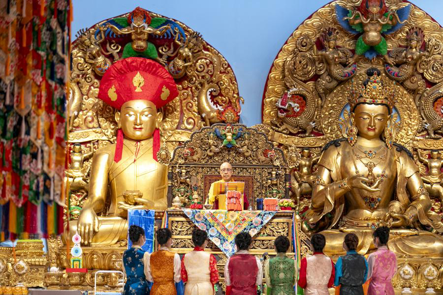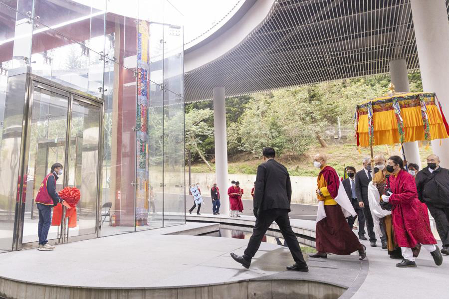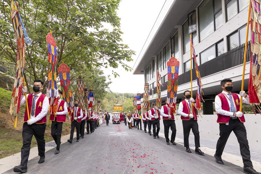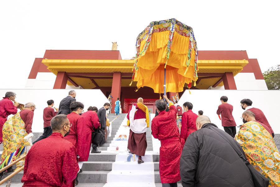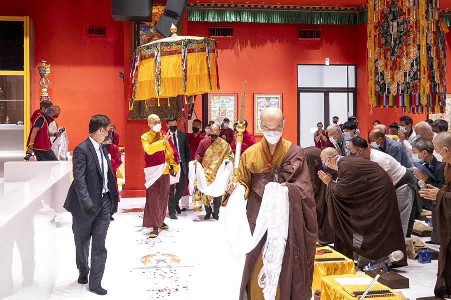 尊貴的 仁欽多吉仁波切在經幡、顯密出家眾、八供女、寶傘、樂器、薰香的前導及迎請下,行經灑滿鮮花的八吉祥白地毯進入佛寺大殿。