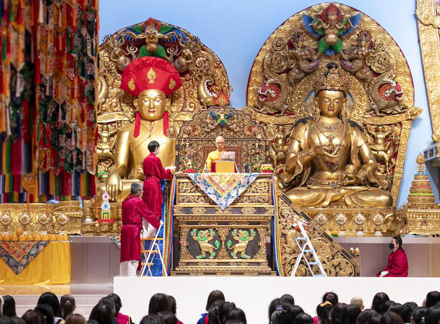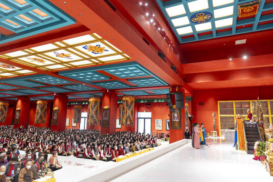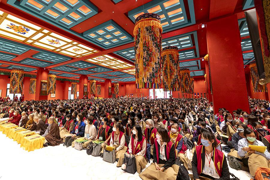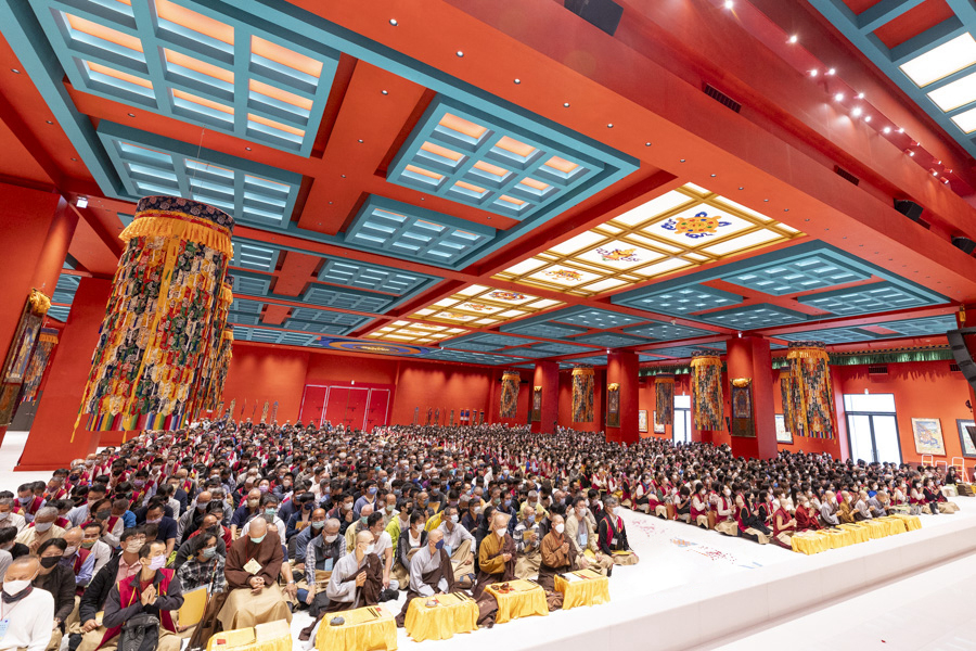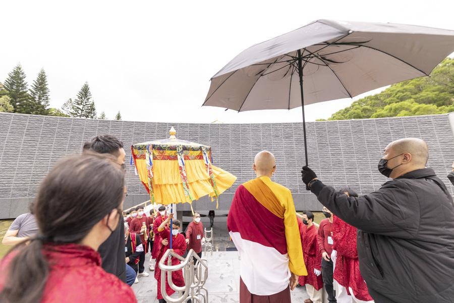 下午2點,寶吉祥佛寺開山住持上師尊貴的 仁欽多吉仁波切在經幡、顯密出家眾、八供女、寶傘、樂器、薰香前導及迎請下,行經灑滿鮮花的八吉祥白地毯進入大殿,仁波切步上壇城,向諸佛菩薩頂禮三拜後升法座。