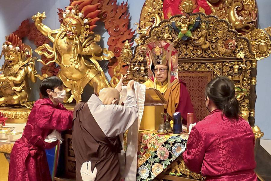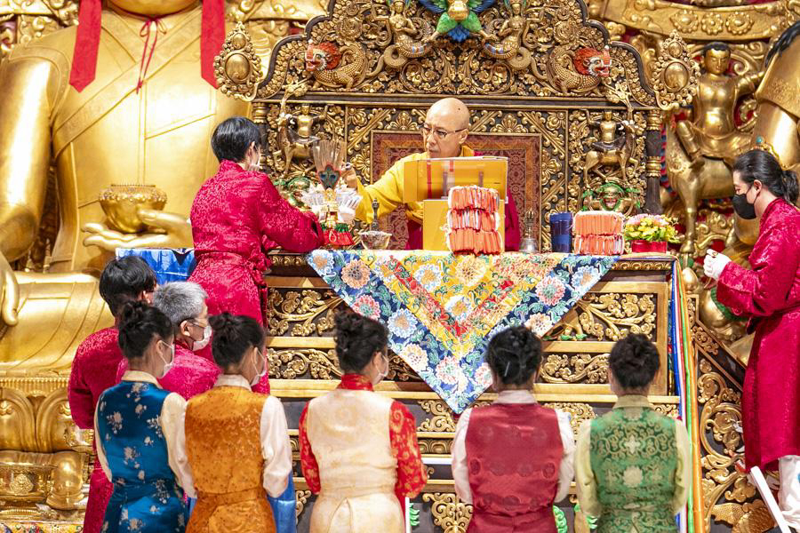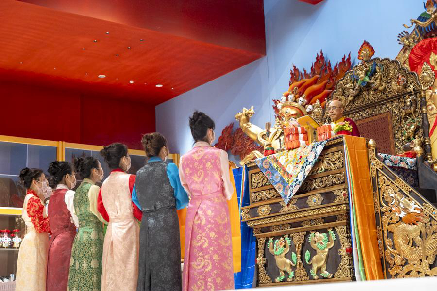 進行獻曼達儀軌時,仁波切戴上岡波巴法帽,由出家弟子眾、八供女代表眾生向尊貴的 仁欽多吉仁波切獻曼達供養。