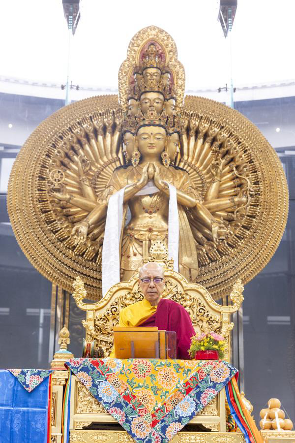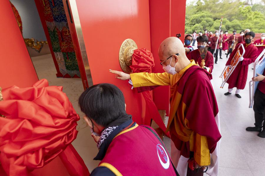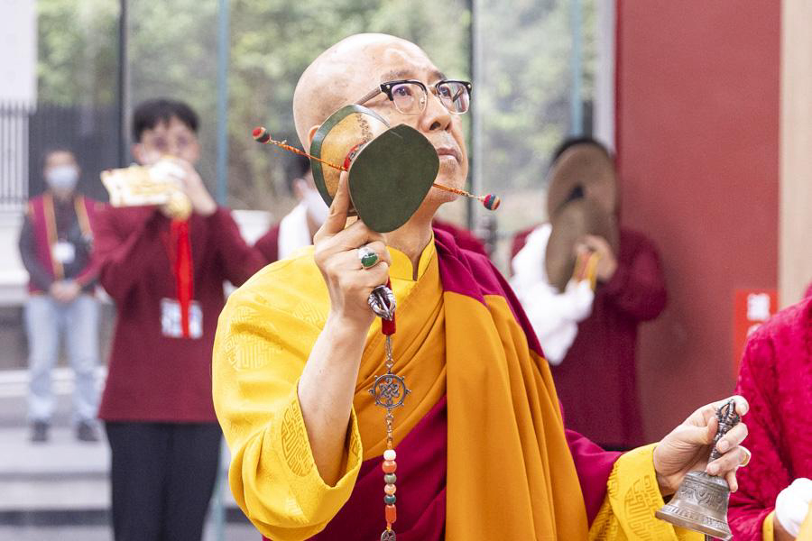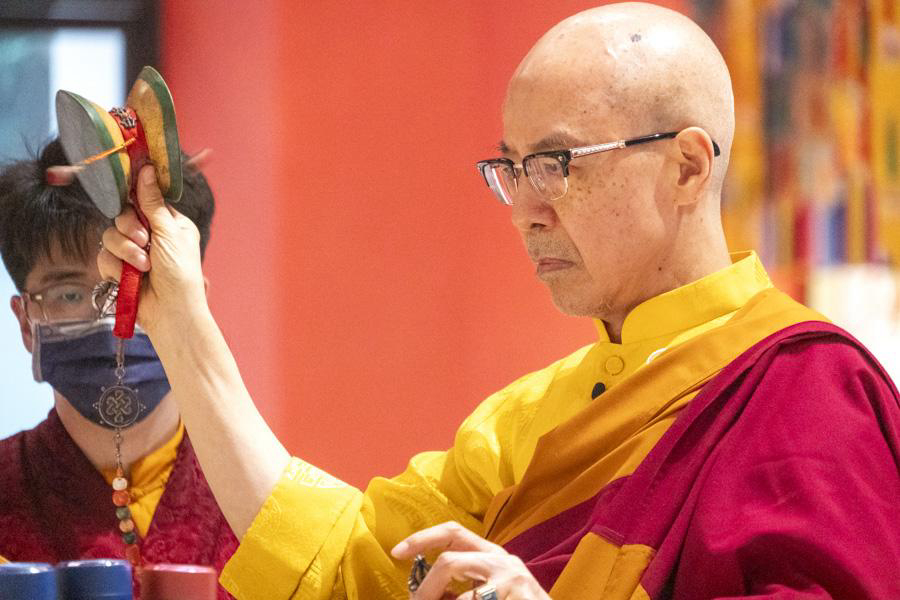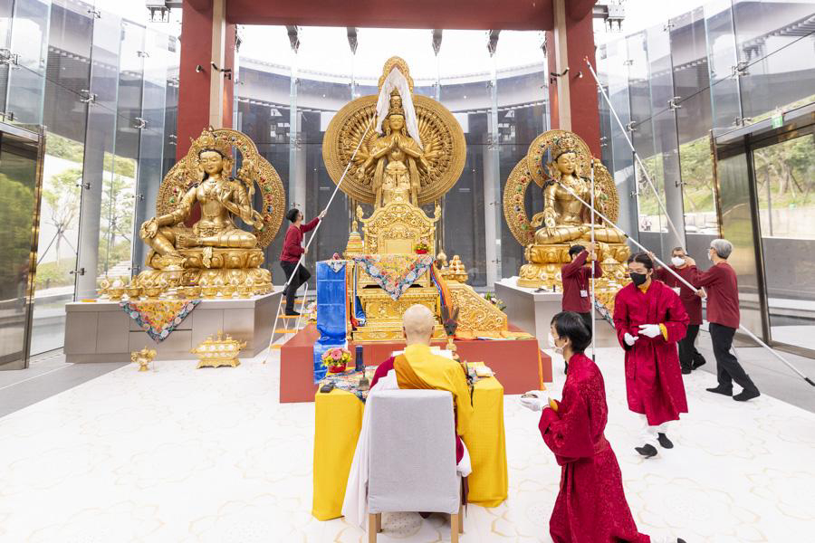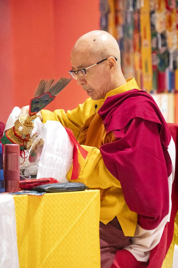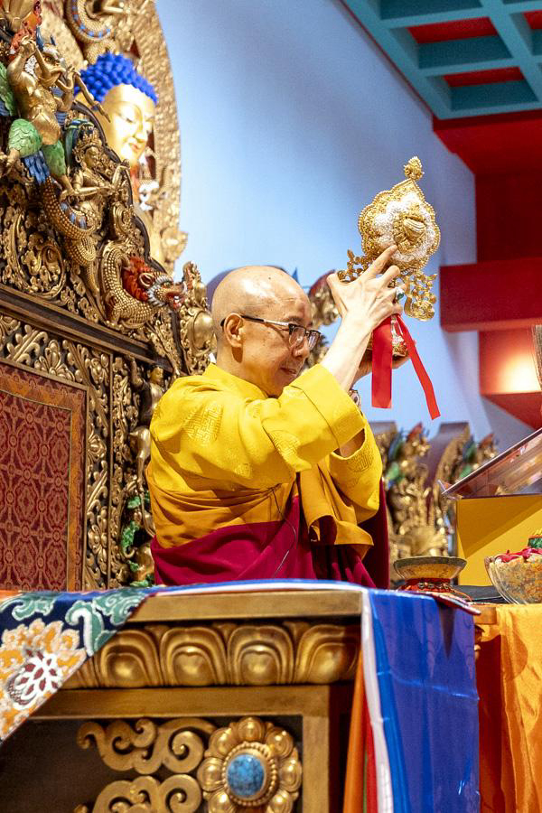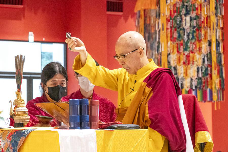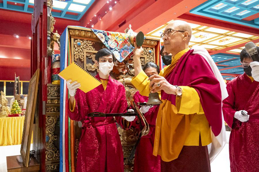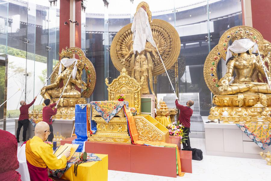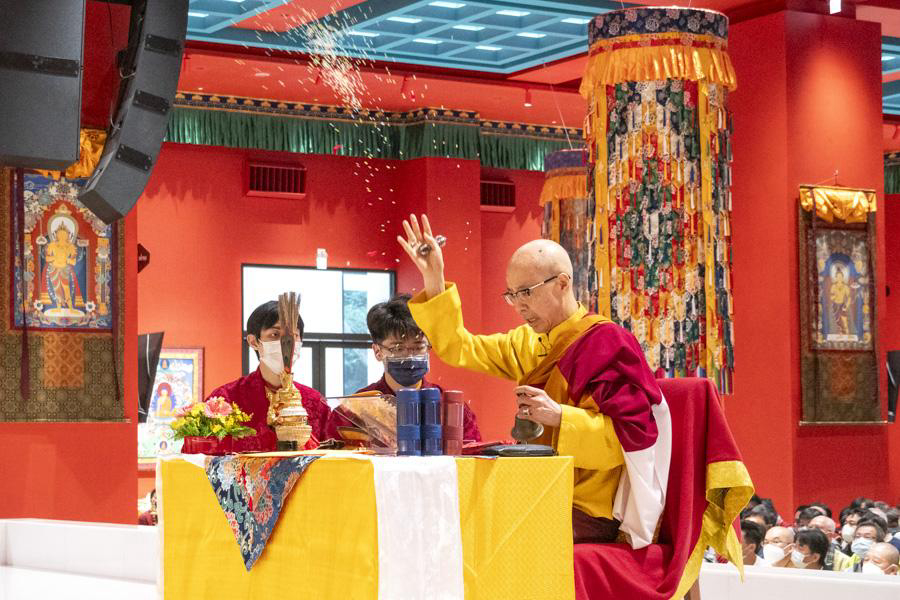 仁波切步上壇城,升開光法座後,賜予珍貴開示。接著,仁波切加持鈴杵,再以自身實修的功德證量,親自為佛像進行開光除魔儀軌,修法時面容現忿怒尊相,加持利益無邊眾生。