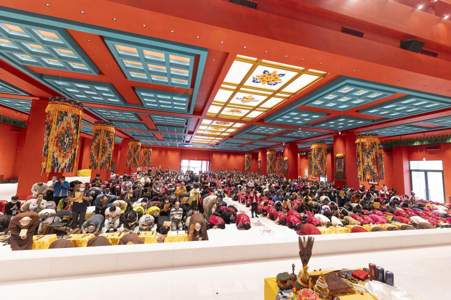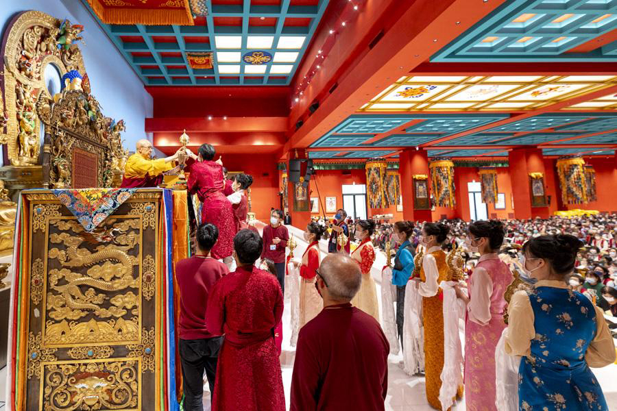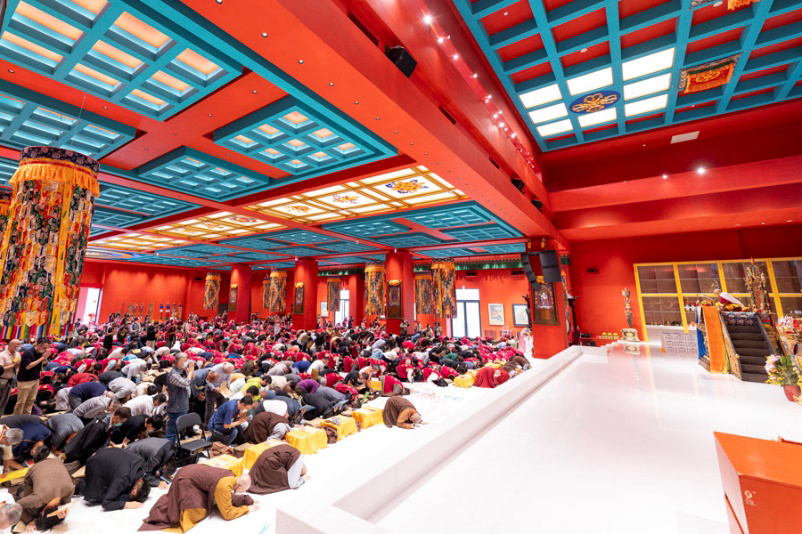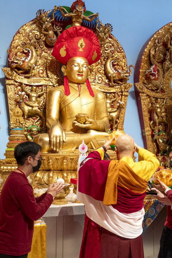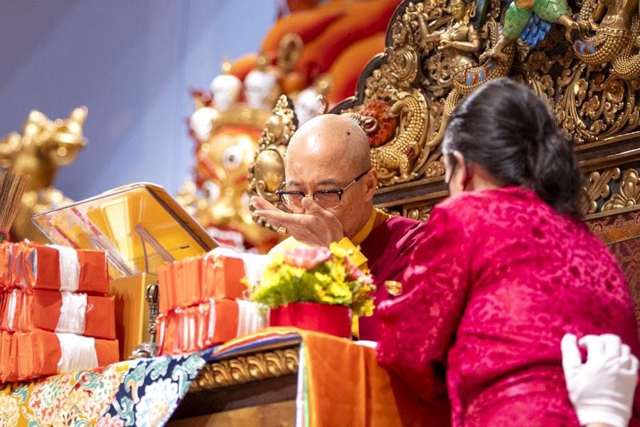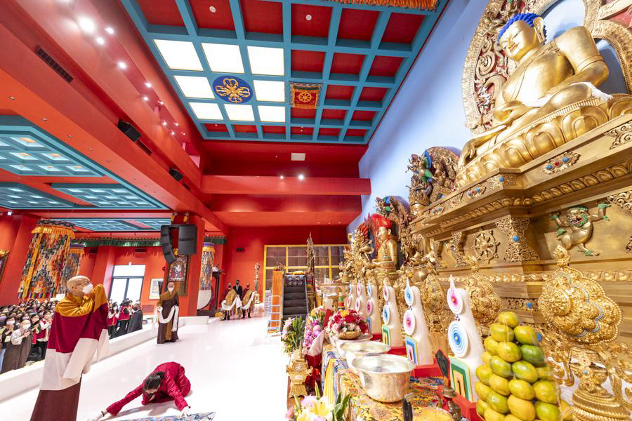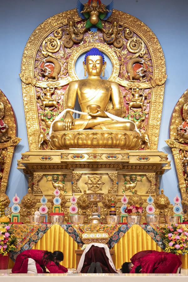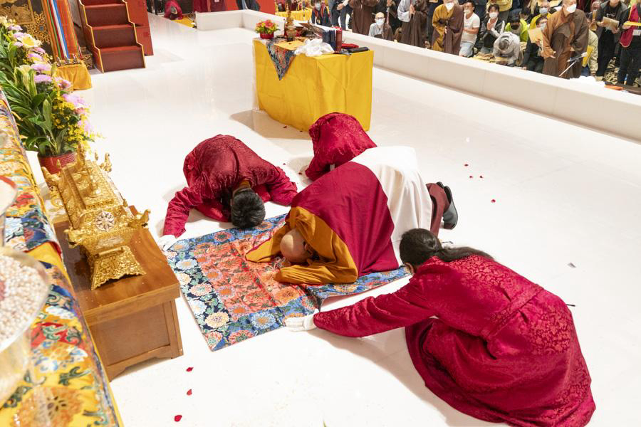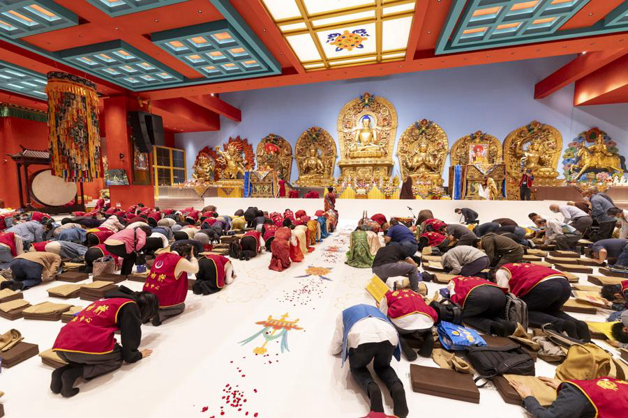 開光儀軌圓滿後,仁波切帶領與會大眾恭敬頂禮諸佛菩薩三遍,並代替眾生供養花束。