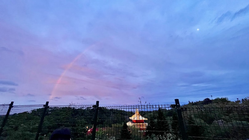 法會結束後傍晚時分,眾等法喜充滿,歸途中步行於寶吉祥佛寺的大道上,驚喜望見霞光滿天伴隨著美麗的彩虹,瑞相極為殊勝。佛寺金頂在靜謐的山谷裡閃耀光芒。天空飄下細細雨花,如甘露法雨般令眾生同霑法益。寶吉祥佛寺在 仁欽多吉仁波切的大願下,定能利益更多眾生,帶來祥和與安樂。